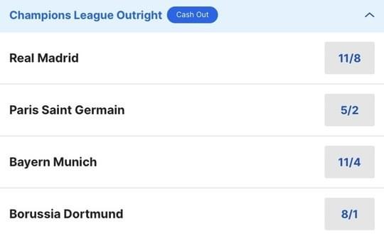 The new favourite for the 2023/24 Champions League are Real Madrid at odds of 11/8. Those odds imply that Real Madrid have a 42.1% chance of continuing their illustrious history in the competition and tag as "European Specialists".