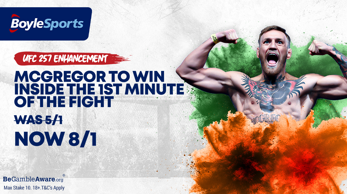 BoyleSports are enhancing the chances of McGregor getting the job done within 60 seconds to 8/1 from 5/1 in the hours before he takes to the Octagon, as the chances of the fight going the full distance have been drifting gradually all week and now sit at 3/1 from a low of 9/4.