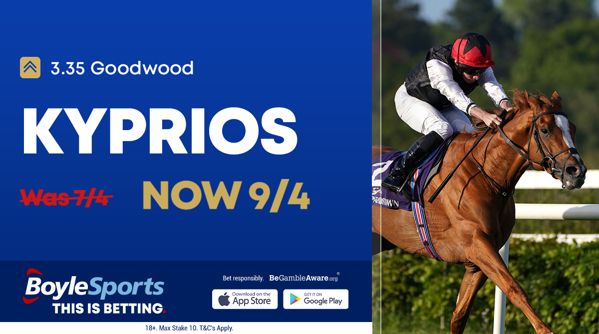 BoyleSports have cut Kyprios into 11/8 favourite to win the first Group One of the Goodwood Festival with Ryan Moore booked to ride. * Price at the time of writing & subject to fluctuation.