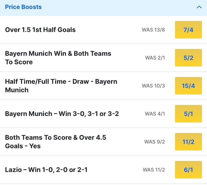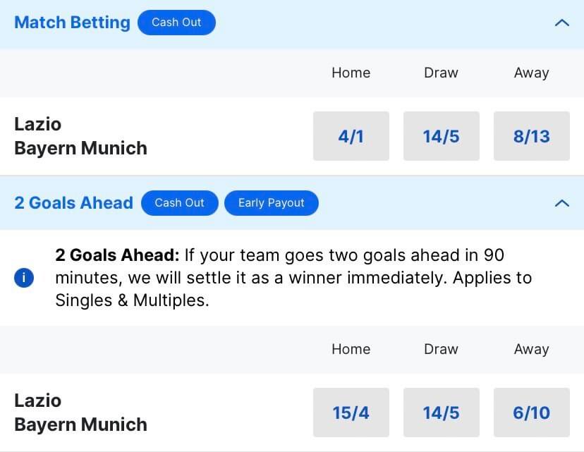| Lazio v Bayern Munich Betting Odds - Premier League | ||