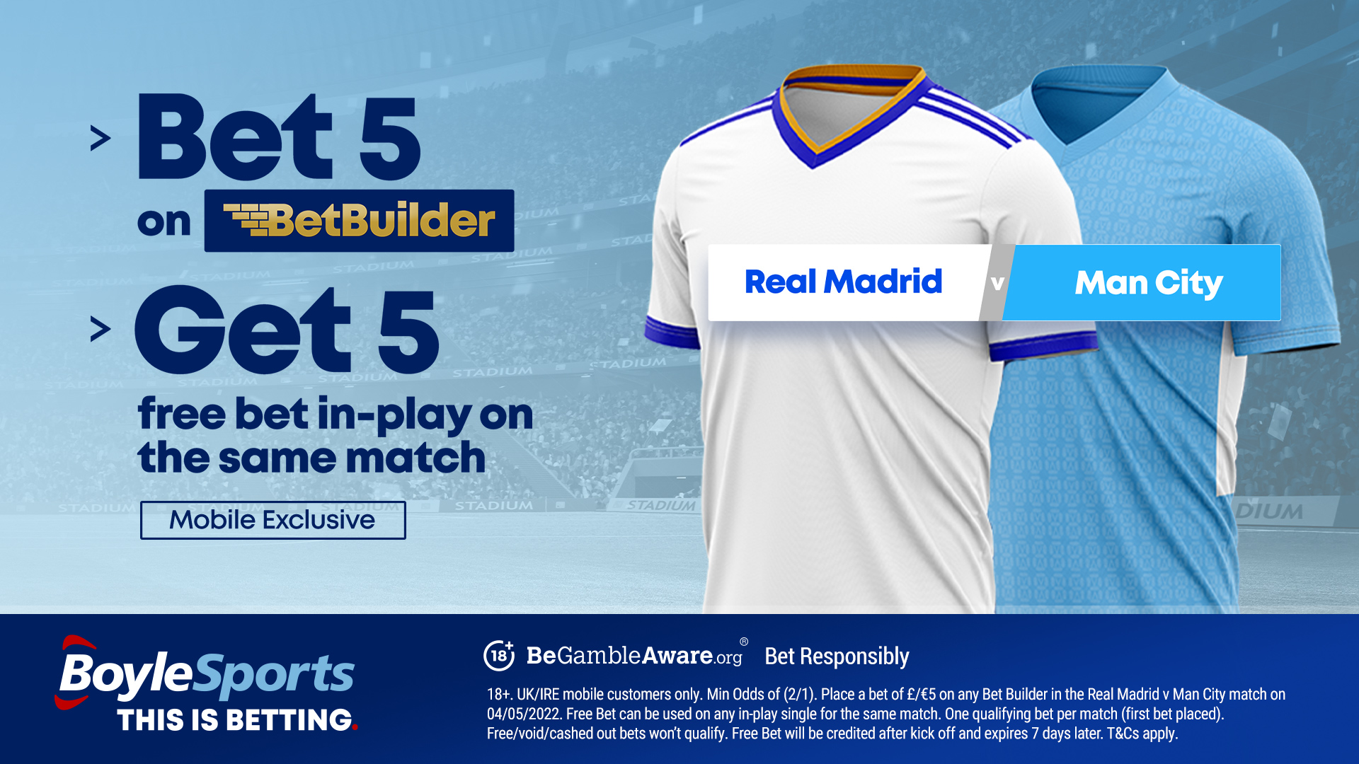 Bet €/£5 on BetBuilder on Man City v Real Madrid, get a €/£5 FREE BET to use in-play on the match!