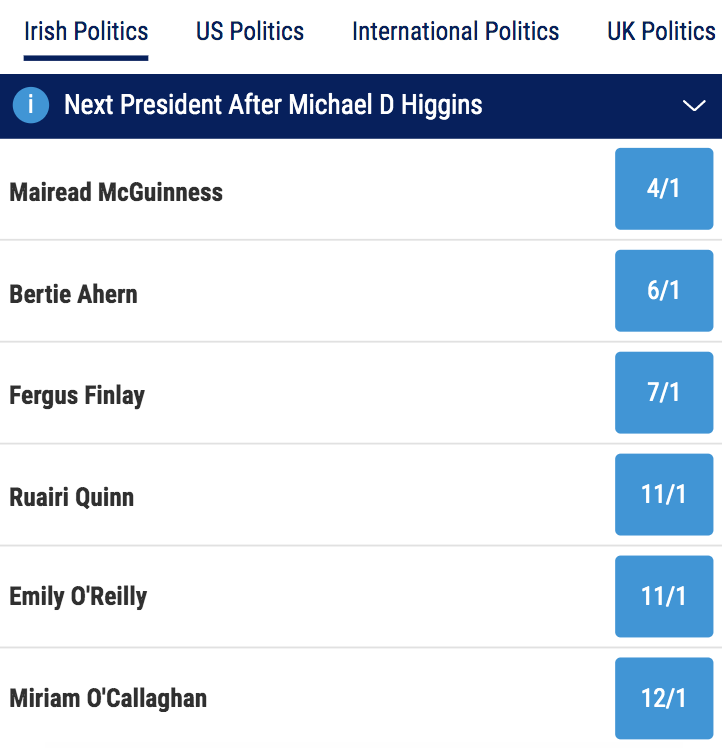 The Dubliner has also been clipped into 6/1 from 25/1 to be the one who replaces Michael D. Higgins as President of Ireland.
